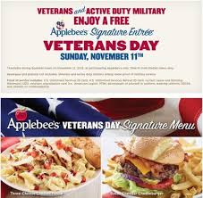 Applebee’s – free meal, Sunday, Nov. 11, 2012: Last year, Applebee’s served over one million free meals to military veterans and active servicemembers. Applebee’s is again offering a free meal to military veterans and active-duty service members on